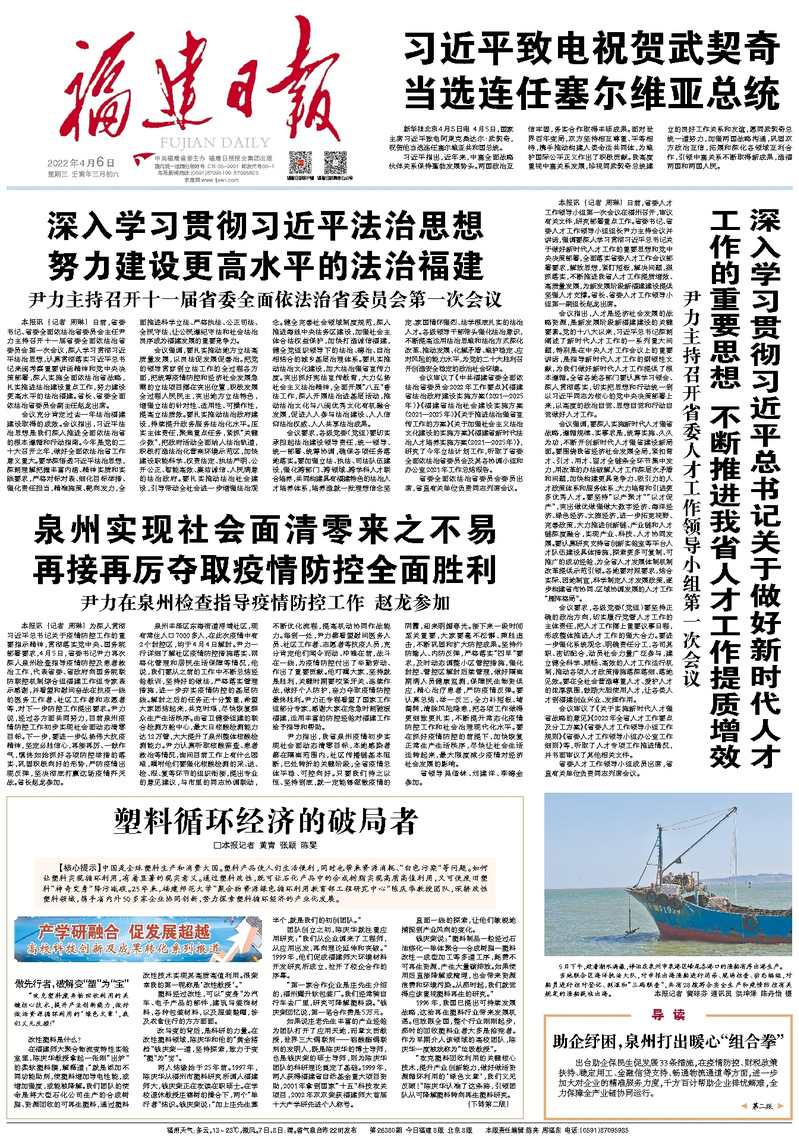 On April 6, the front page of Fujian Daily, titled The Breaker of Plastic Circular Economy, deeply reported the latest research results of Prof. Chen Qinghua's team in plastic circular economy of Engineering Research Center of Polymer Green Recycling, Ministry of Education of FNU.