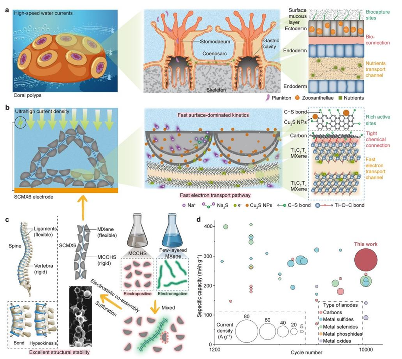 Herein, drawing inspiration from elaborated structures in nature, the research teams propose a dual-biomimetic (both coral polyp-like and spine-like) gradient hierarchical architecture of electrodes. Coral polyps prefer to live in oceanic environments with fast water currents, where they can efficiently capture abundant plankton, and acquired nutrients can be efficiently transported by their laminar cavity of coenosarc. The biological behavior of coral polyps in fast water currents is similar to ion adsorption, conversion, and transportation of sodium-ion batteries (SIBs) at high rates. Besides, mammalian spine — which comprises continuous flexible ligaments and separated rigid vertebras to enable trunk support and flexibility under various body motion states — may offer some inspiration in designing spatial architecture with enhancing mechanical characteristics. Based on the above hypotheses, the research teams integrate mesoporous carbon concave hollow spheres (MCCHS) with few-layered 2D-conductive-network MXene, after sulfuration termed as SCMX through electrostatic induction and chemical welding.