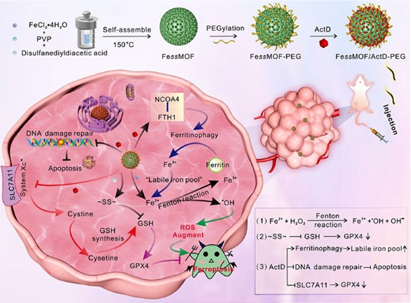 Based on the team’s previous innovative work in breast cancer treatment (Adv. Mate. 2019, 31(46): 1905825; Chem. Eng. J. 2023, 452: 138422; 2023, 452: 139517; Adv. Healthcare Mater. 2024: 2304522; 2024, 13(4): 2302537; Int. J. Bio. Macromol. 2024, 258: 128952), Zeng Xuemei’s research team from the College of Life Sciences of FNU and Prof. Yan Shuangqian’s research team from the Straits Institute of Flexible Electronics (SIFE, Future Technologies), jointly demonstrate a highly effective tumor ferrotherapy using iron (II)-based metal-organic framework (FessMOF) nanoparticles, assembled from disulfide bonds and ferrous ions. The as-prepared FessMOF nanoparticles exhibit peroxidase-like activity and pH/glutathione-dependent degradability, which enables tumor-responsive catalytic therapy and glutathione depletion by the thiol/disulfide exchange to suppress glutathione peroxidase 4. Upon PEGylation and Actinomycin D (ActD) loading, the resulting FessMOF/ActD-PEG nanoplatform induces marked DNA damage and lipid peroxidation. Concurrently, the teams find that ActD can inhibit Xc- system and elicit ferritinophagy, which further boosts the ferrotherapeutic efficacy of the FessMOF/ActD-PEG. In vivo experiments also demonstrate that the fabricated nanoplatform presents excellent biocompatibility and a high tumor inhibition rate of 91.89%.