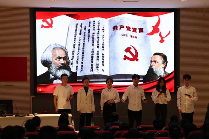 活动中,现场师生通过收看专题记录片《恩格斯的故事》和《不朽的马克思》(节选),回顾了恩格斯的传奇一生和卓越的历史贡献,学习了马克思主义思想在中国革命、建设、改革中的重要作用。青年学生朗诵了《共产党宣言》节选,向两位伟大思想家致敬。